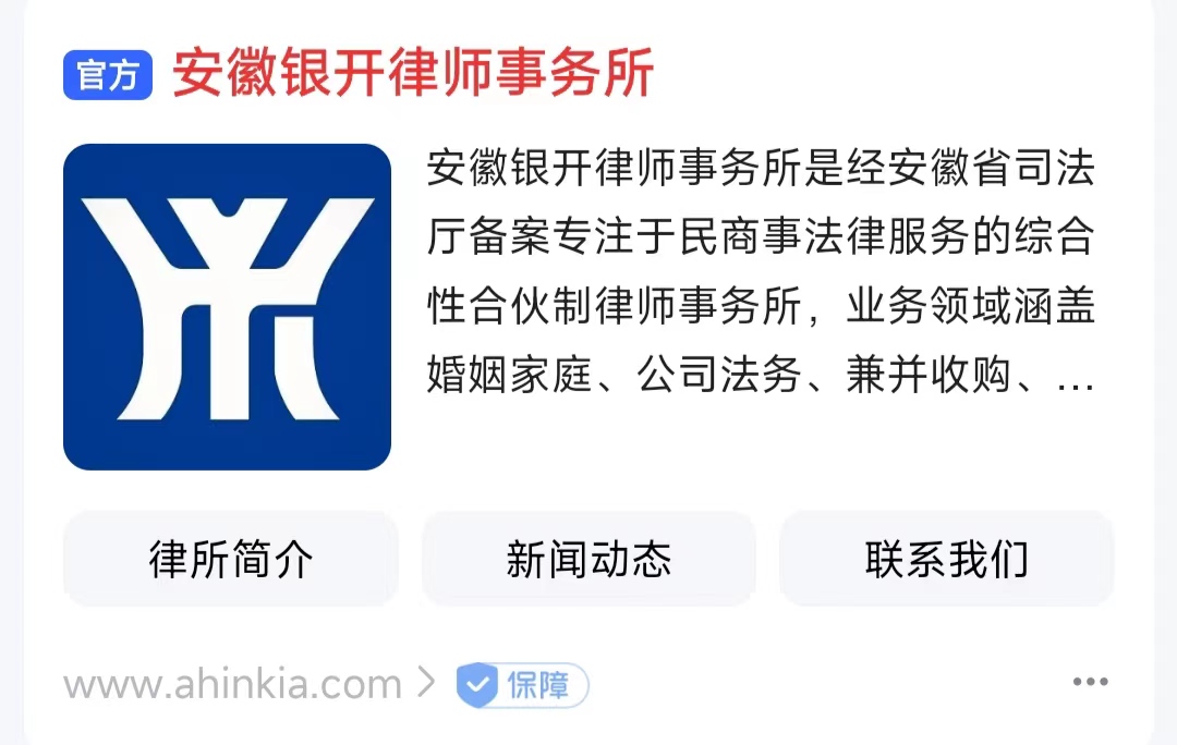 安徽银开律师事务所官网成功通过百度实名认证,并成功加入百度保障计划!有保标才保障!有V才更靠谱!百度保障计划是指通过有百度保障的网站发生交易产生直接经济损失可向百度申请保证金!获得百度先行赔付,并得到百度消费维权支持!百度网民权益保障计划是由百度与中国消费者协会联合发起,网民登录百度账号点击搜索推广或带有“保”标识的结果,如因假冒官网、资质或钓鱼欺诈而蒙受经济损失,网民可向百度申请保障。百度负责先行赔付网民损失。